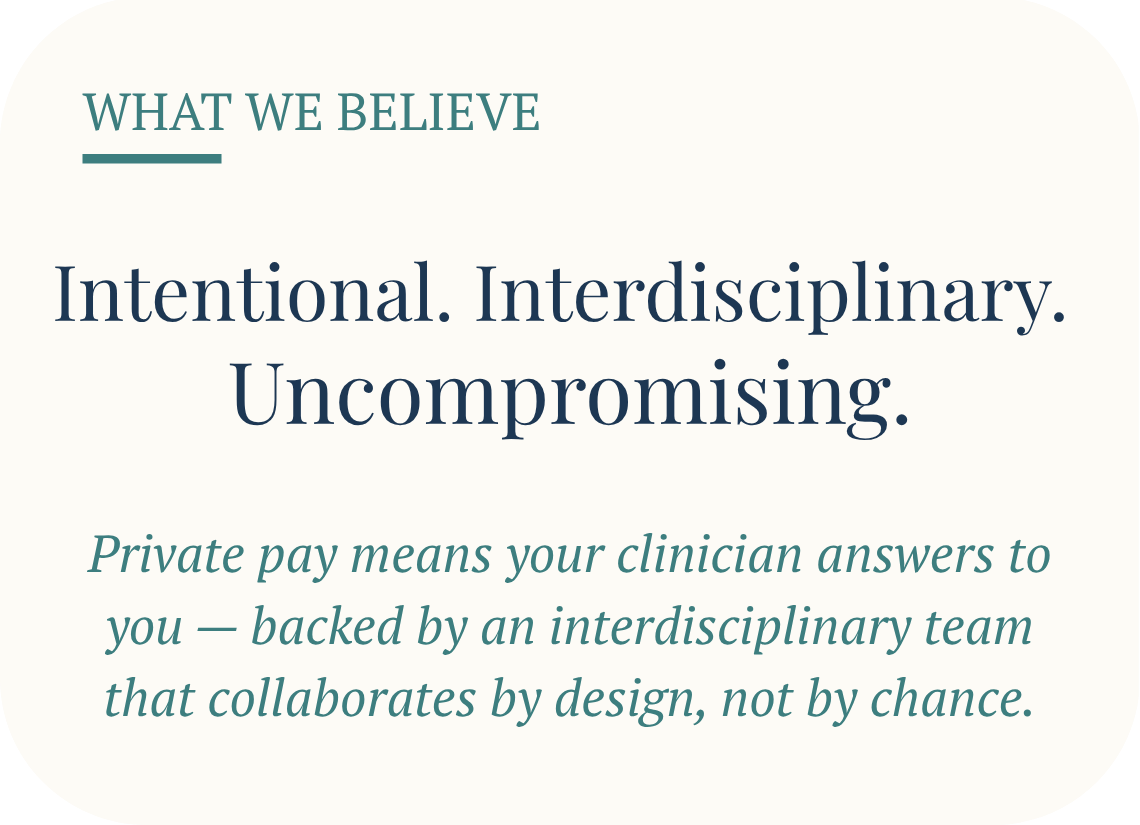 We built this practice around a simple belief — exceptional care requires time, collaboration, and freedom from insurance constraints. Sessions happen entirely online, from wherever you feel most at ease. Your clinician is free to focus on one thing — what's actually best for you. No arbitrary session limits, no prescribed approaches, no compromises.